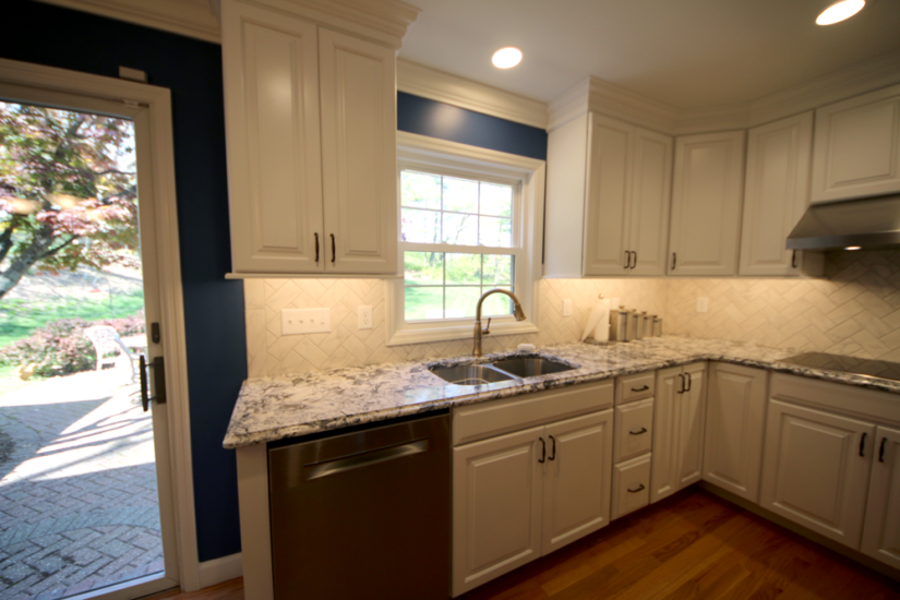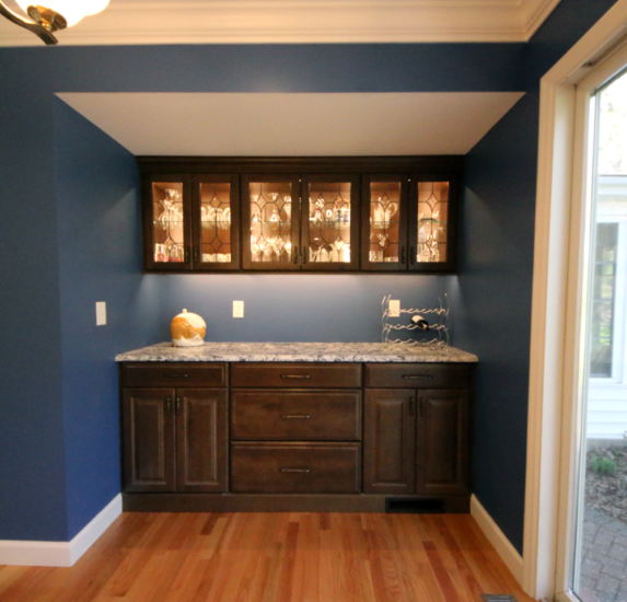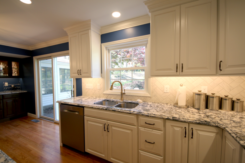 A home kitchen renovation, featuring contrasting cabinetry of deep browns and off-white by Agape Construction.